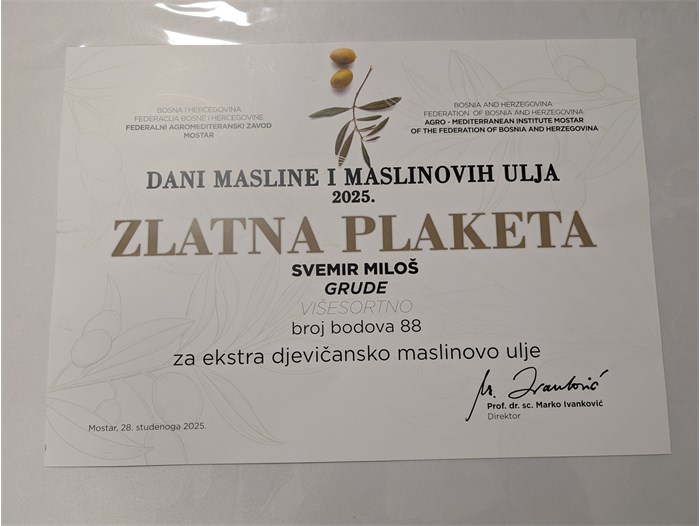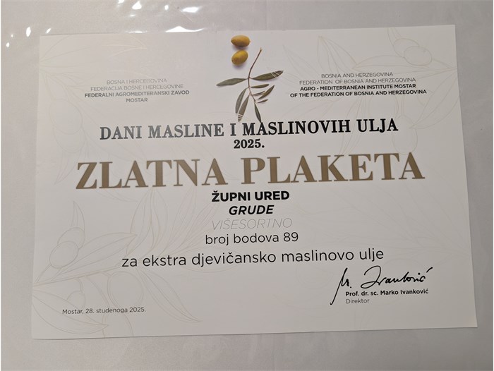 Lijepo je odjeknula ovih dana vijest da je na Danima masline i maslinovih ulja u Mostaru uručeno priznanje za 165 uzoraka maslinovog ulja iz Hercegovine te dijela Hrvatske. Dodijeljene su zlatne, srebrne i brončane plakete proizvođačima iz šire regije.